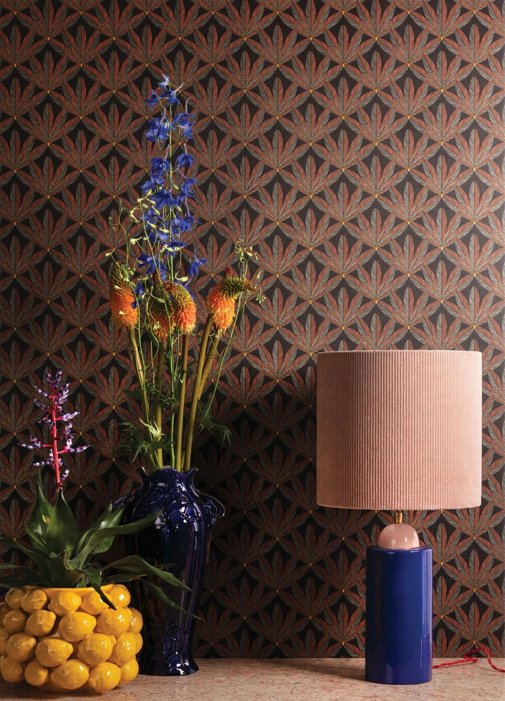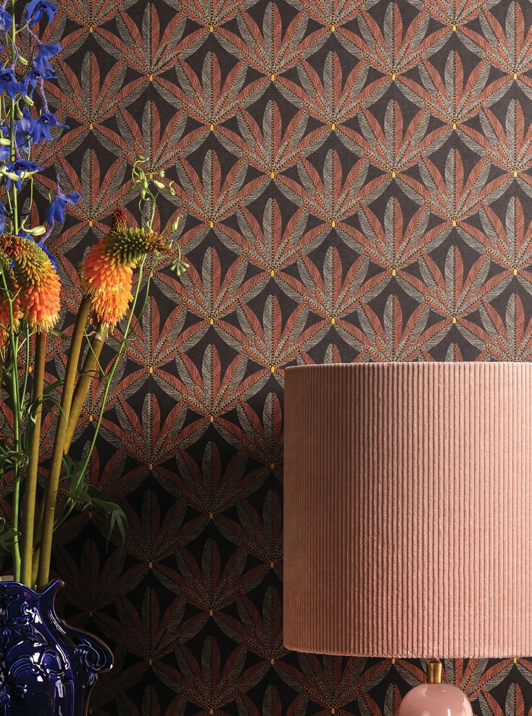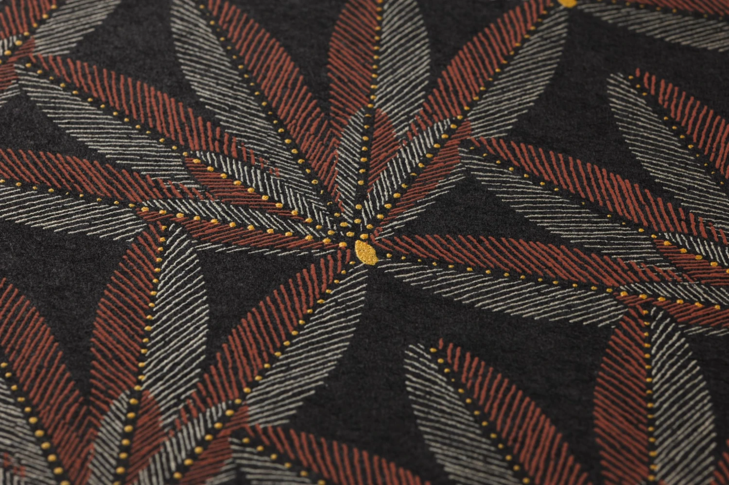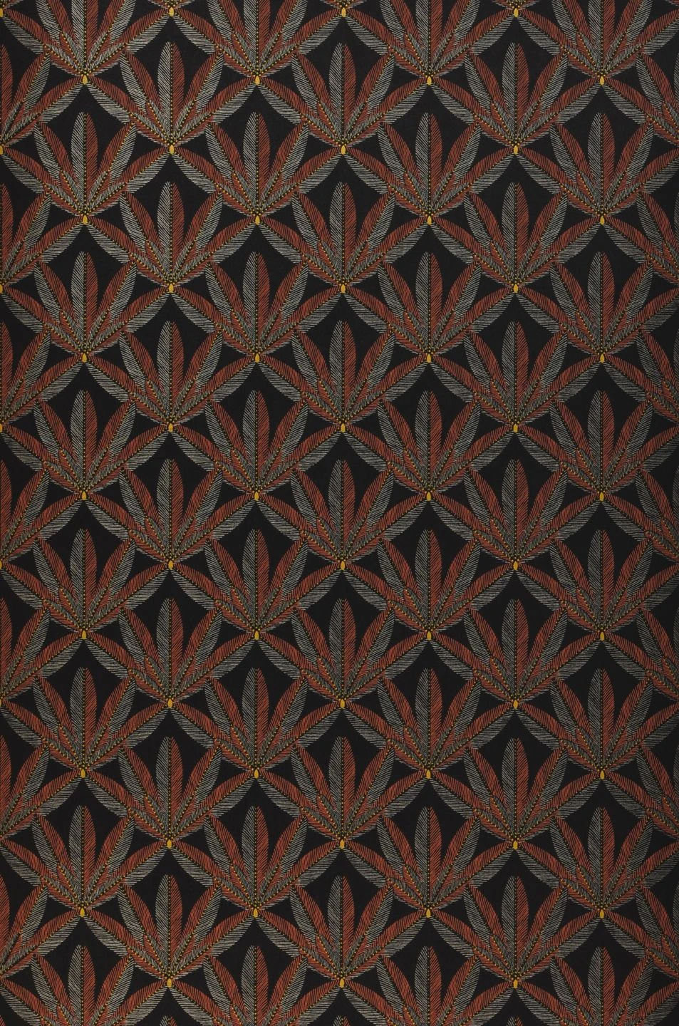 Ornamente aus stilisierten Blättern, mit wenigen kupferbraunen und hellgrauen Linien schraffiert auf dem schwarzbraunen Grund, bilden das wirkungsvolle Design im Stil des Art Deco. Die dunklen Farbtöne schmücken Ihren Raum und lassen ihn ruhig und hochwertig wirken. Gelbe Punkte verzieren das Muster der Vliestapete mit hellen Highlights. Charaktervolle Retro-Möbel in dunklen oder rötlichen Holztönen sind eine perfekte Ergänzung.