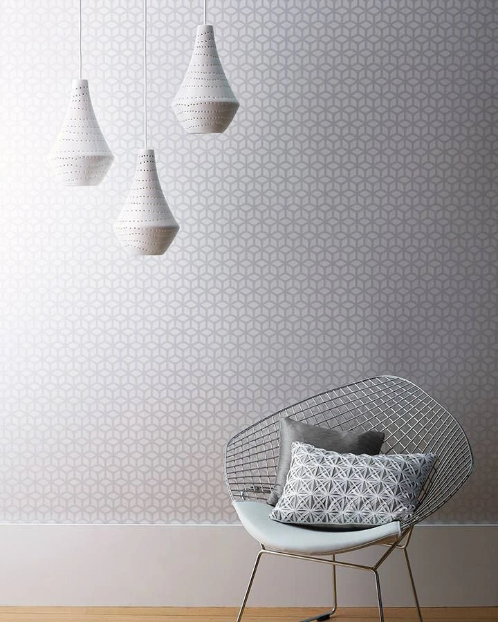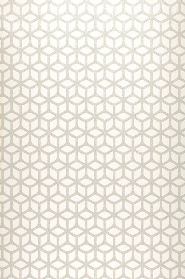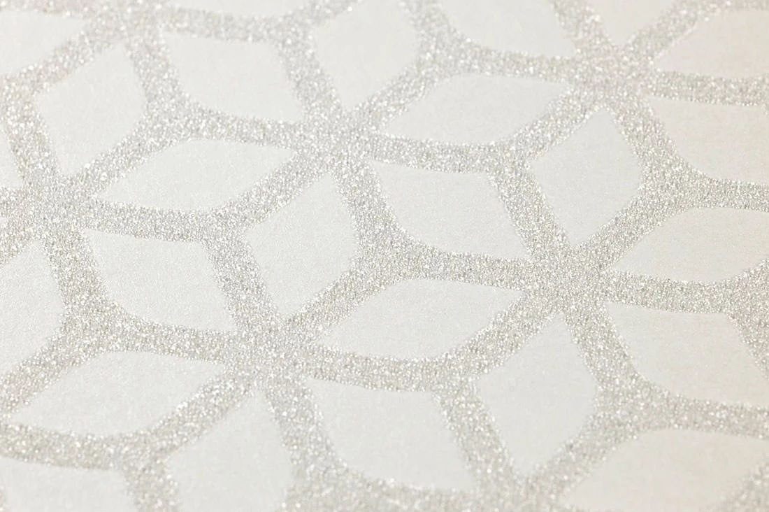 Das Muster aus Glasperlen dieser cremeweißen Tapete ist den Bienenwaben nachempfunden. Die Perlen schimmern Weiß-Silber und zaubern ein ausdrucksvolles Ambiente.