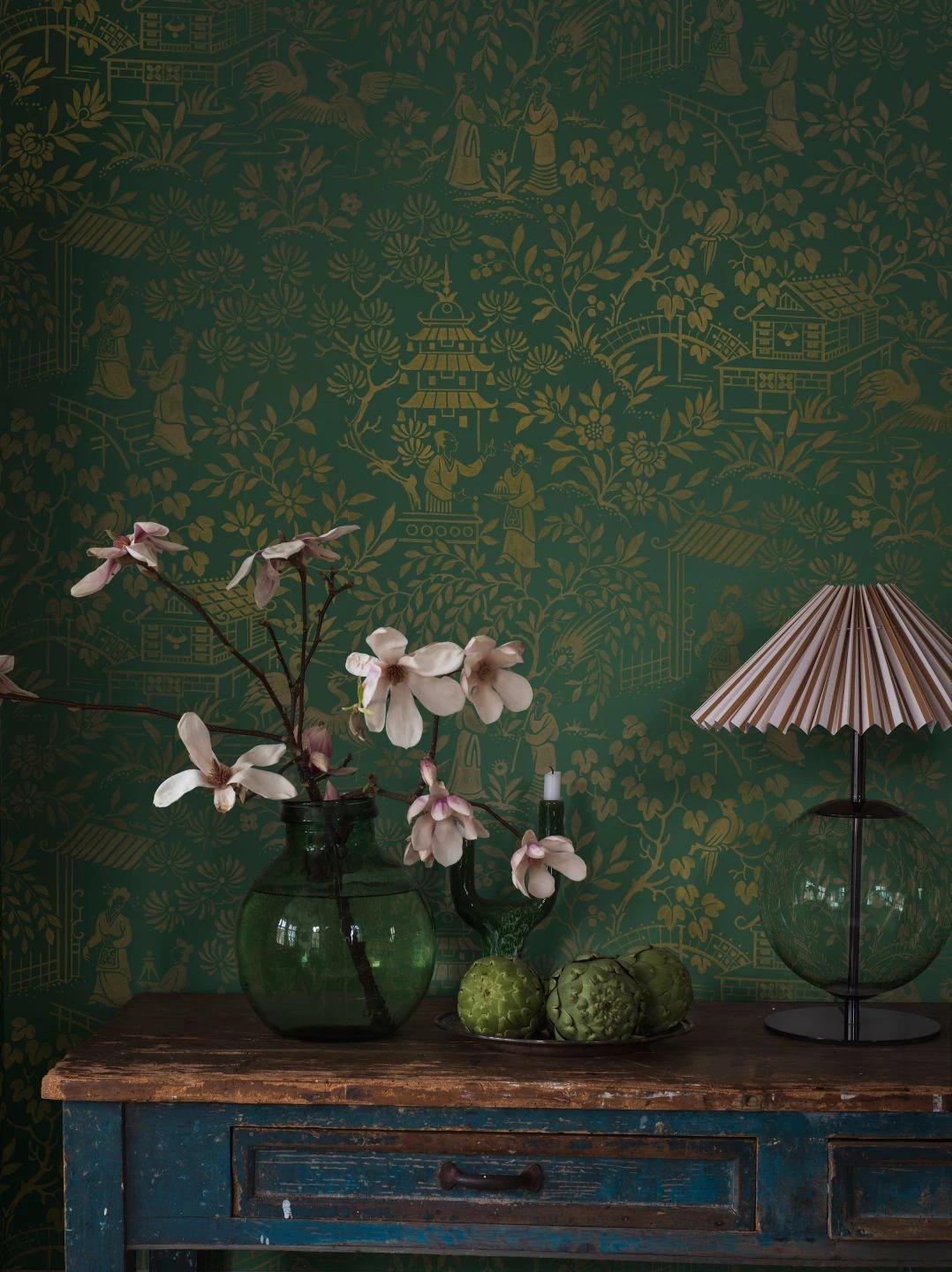 In schlichten, flächigen Formen, wie mit einem Stempel auf den patinagrünen Grund aufgebracht, schaffen stilisierte Szenen einer Parklandschaft voller Tempel, Brücken und Kraniche, dazwischen einige menschliche Figuren, ein fernöstliches Ambiente. Die Kombination des golden schimmernden Musters und des dunklen Grün machen Vliestapete Zen Garden zu einer zeitlos kostbar wirkenden Kulisse für Ihre Einrichtung im orientalischen Stil.
