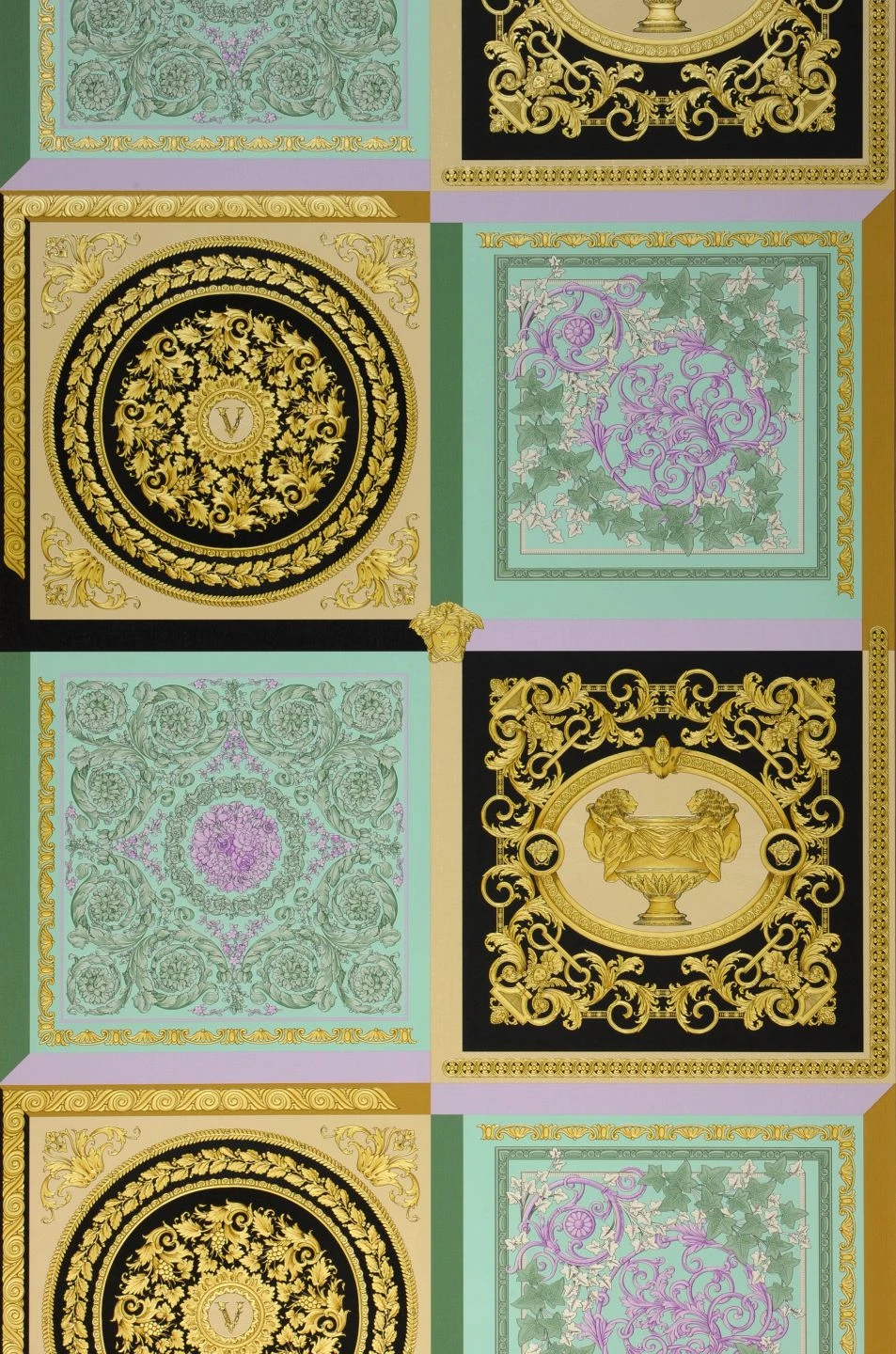 Die Gegensätze könnten stärker nicht sein: Zwischen den streng unterteilten Musterquadraten und den verschnörkelten, barocken Mustern darin, zwischen den Farbkombinationen Gold und Schwarz einerseits und Resedagrün-Violett andererseits, zwischen den barocken und antiken Anleihen und ihrer modernen, ungewöhnlichen Verbindung auf Vliestapete Minerva. Der Muster-, Farb- und Stilmix macht Ihre Wände zu wahren Kunstwerken in Ihrer Einrichtung.