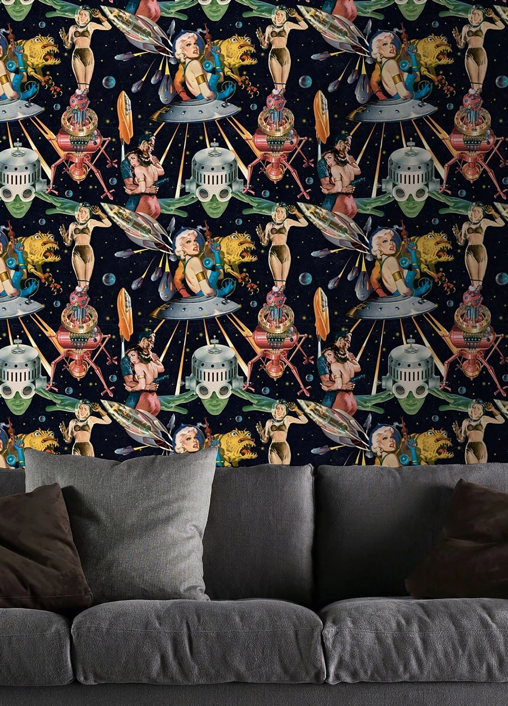 „Der Weltraum. Unendliche Weiten.“ Helden und Schurken, Raketen, Sonnen und Planeten, fantastische Monster und geheimnisvolle Wissenschaftler – das Wandbild Other Worlds nimmt Sie mit in die abenteuerliche Welt der Science Fiction. In der bunten, actionreichen Ästhetik von Filmplakaten oder Comic Strips aus der Mitte des vergangenen Jahrhunderts wird Ihr Raum zum Raumschiff auf der Reise zu fremden Welten.