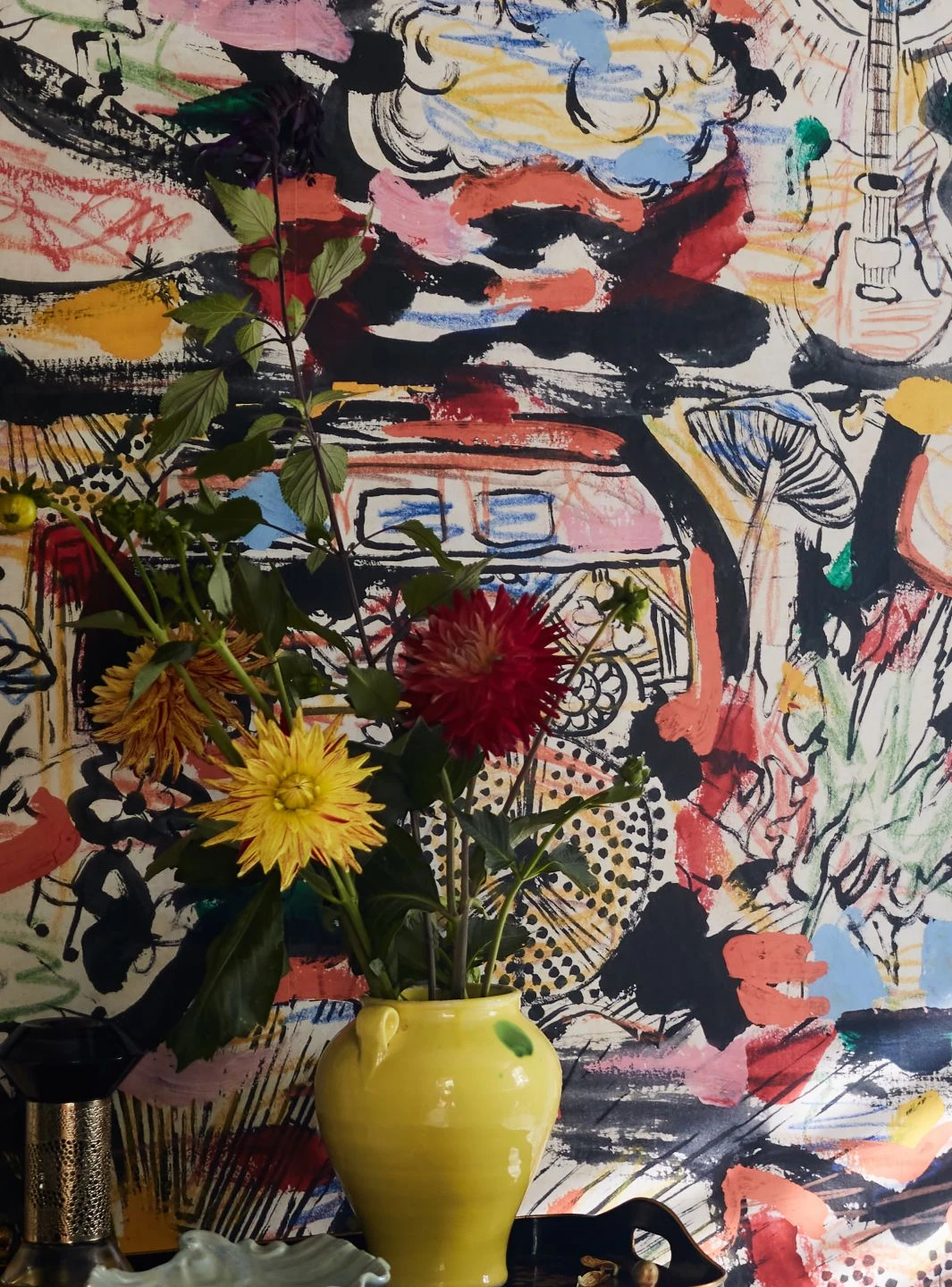 Das farbenfrohe dreiteilige Wandbild beschwört voller Dynamik den Sommer 1969 herauf – den Sommer, in dem das legendäre Woodstock-Festival stattfand. Das kraftvolle Design scheint unter dem Eindruck der Musik jener Ära entstanden zu sein, voller Ausdruck, Lebendigkeit, psychedelischer Elemente und dem Loslösen von Altbekanntem. Die außergewöhnliche Tapete mit ihren bunten Farben verträgt charaktervolle Möbel aus den 60er Jahren, die eine der Motivfarben aufgreifen und betonen.